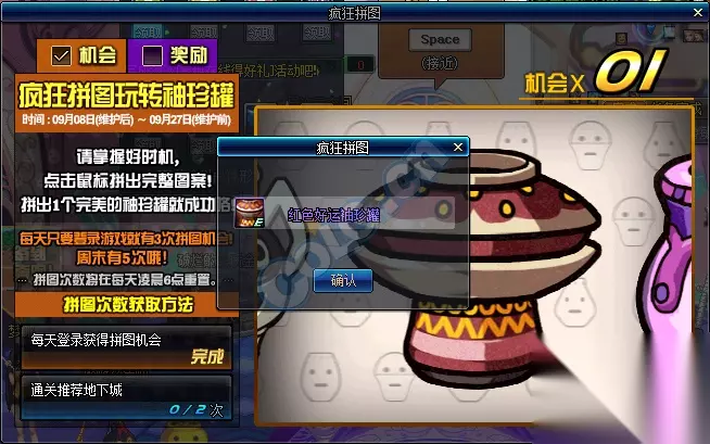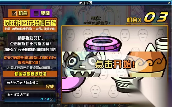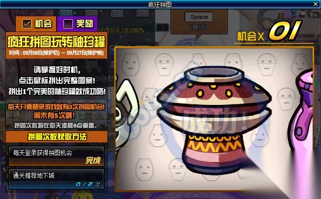 拼图游戏相信大家都很喜爱吧,DNF在游戏中也推出了拼图活动。DNF疯狂拼图玩转袖珍罐活动有什么奖励?小编在这里就来为大家介绍一下DNF最新活动疯狂拼图玩转袖珍罐活动的具体内容。 【疯狂拼图玩转袖珍罐】 活动时间:9.8-9.27 活动内容: 每天通关推荐地下城可获得拼图机会(有上限),每天登陆游戏有3次拼图机会,周末5次拼图机会