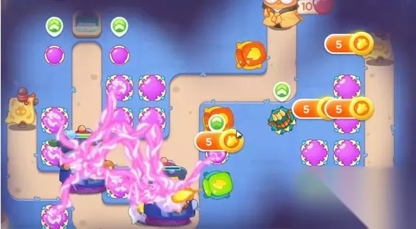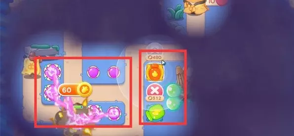 4、我们及时点果冻,右侧炮塔往右拆,空格放多重箭和火炮瓶,锁右侧障碍物。 5、接着我们放炮塔,开阔视野及时消灭敌人。 6、我们第六波把火炮瓶、魔法球升满级,道具全拆。