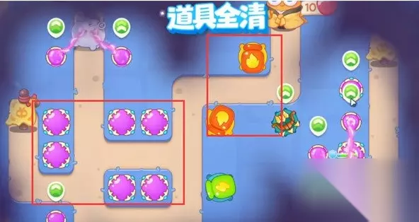 7、然后我们第七波第八波及时点掉果冻即可。 8、最后我们优先锁释放果冻的炮塔,最终炮塔摆放位置如图所示。