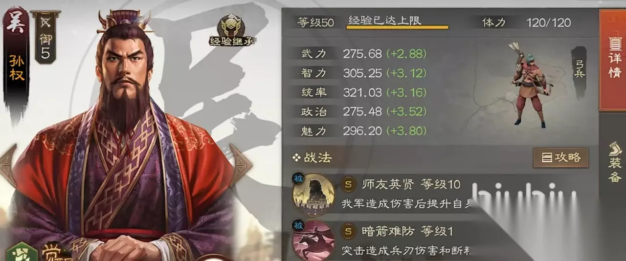 孙十万,不同于其他的两位君主作为弓兵的他自带战法,能够将自身所遭到的buff开释出去,耗费一些增益用来增强队友。所以一定要带上传承战法形机军略来补足高额的输出和策略损伤,简略来说,这个便是一个能辅佐的输出射手。