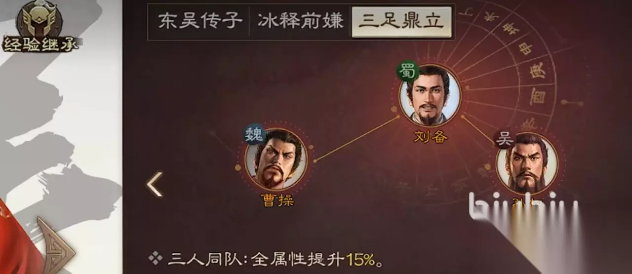 1、阵型思路 咱们都十分清楚三国志这个游戏基本上都是围绕着魏,蜀,吴三个国家进行构成的,每个阵型都有着自己专属的纠缠以及首要武将特征,那么,假如咱们将三国的领袖集合在一同,又能抽出怎样的纠缠呢。在游戏中,官方特意设置了一个三皇纠缠,刘备曹操孙权,三个人为集团的领袖能够凑成三国鼎立的强力buff,三人同队的话,将全特点提高15%,这是什么概念,作为五子良将的特点纠缠,他们也只要武力值提高4%,鼎足之势是他的3倍朝上,这使得大部分情况下,光靠本质就能够碾压绝大部分的部队。