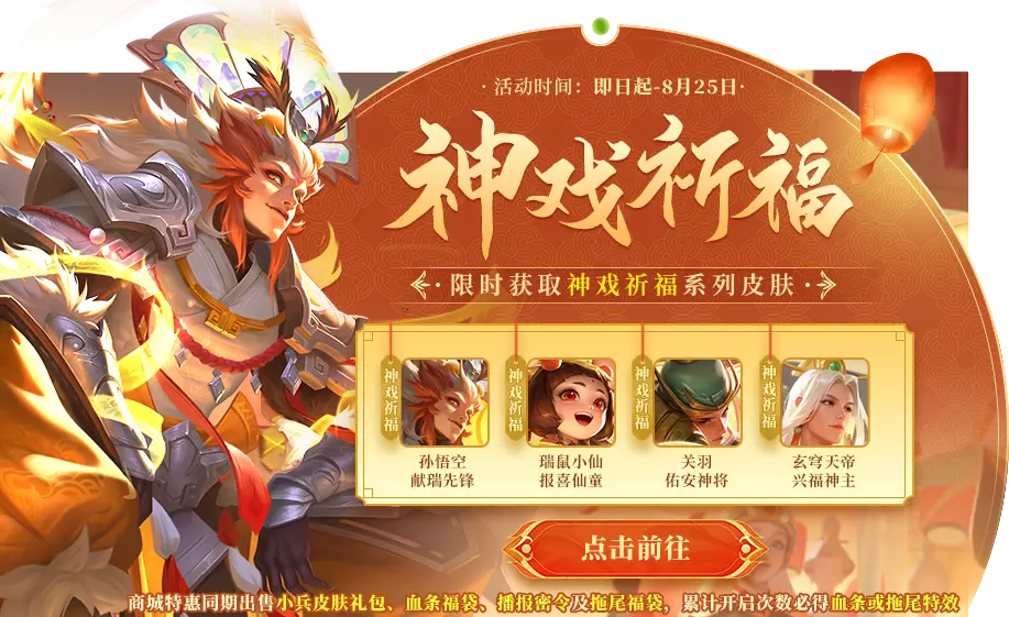 神戏祈福套系皮肤兑换活动开启!通过每日登录礼包获得兑换币到达一定数量即可兑换孙悟空-献瑞先锋、瑞鼠小仙-报喜仙童、关羽-佑安神将、玄穹天帝-兴福神主!