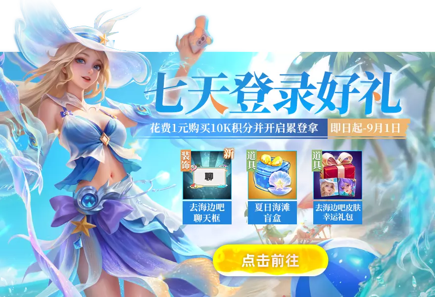 仅需一元购买10K积分,即可开启连续7天的登录福利!拿去海边吧皮肤幸运礼包、暑期主题聊天框、夏日海滩盲盒!