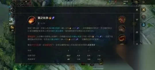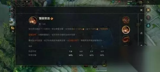 一技能:龙牙突刺 强化希瓦娜下次普攻,使出双重攻击,分别造成65(100%AD)及14(20%AD)物理伤害。 圣龙形态:攻击范围扩大,并对所有目标附加命中效果 击杀元素土龙后,赋予此技能裂地重压效果,在圣龙形态下,龙牙突刺将减速敌军60%。