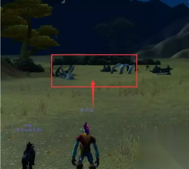 4、等我们绕过来之后会看到地上有一堆科多兽的白骨,这里就是埃其亚基的巢穴了。