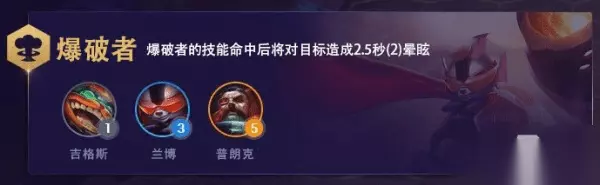 羁绊: 银河魔装机神:(3)战斗开始时,三个银河魔装机神英雄将合体为超级机甲直至阵亡。 ○ 安妮 �C 2阶(银河魔装机神/法师):前排技能伤害 ○ 兰博 �C 3阶(银河魔装机神/爆破):前排技能伤害 ○ 菲兹 �C 4阶(银河魔装机神/渗透者):后排控制&伤害 爆破:(2)爆破英雄们的技能将造成晕眩2.5秒