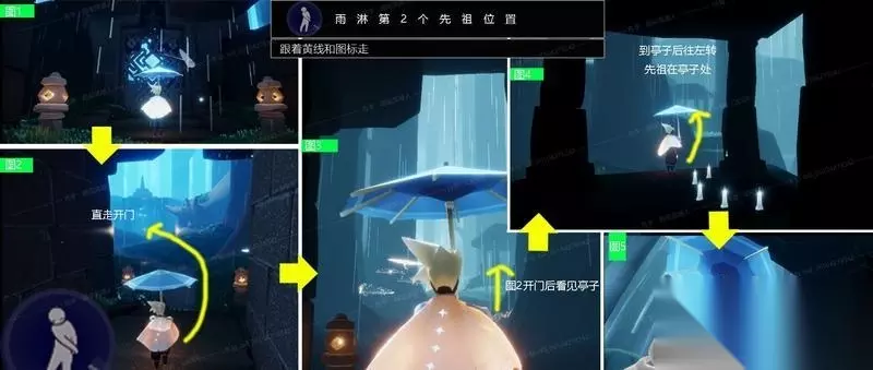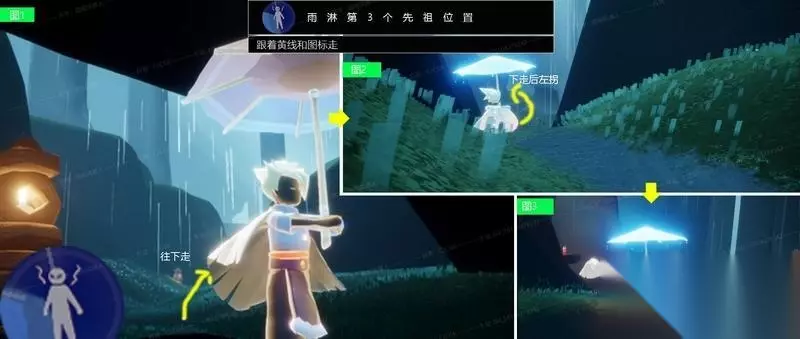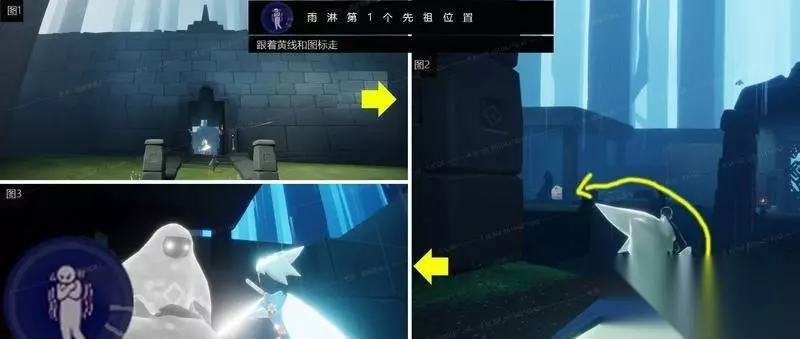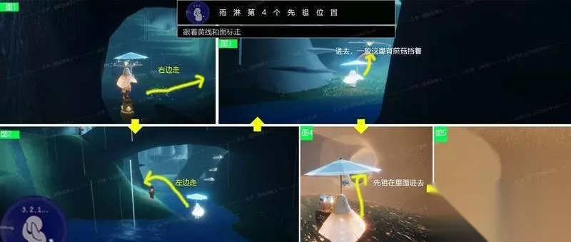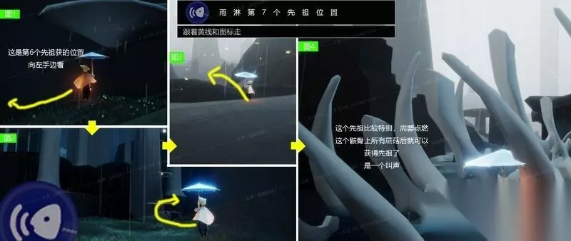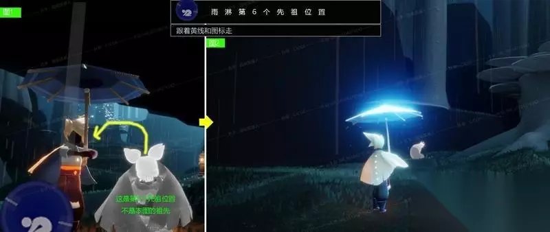 第4个先祖 动作:捉迷藏 第4个先祖的位置依旧是接着第3个先祖拿完后的路线了。拿完第3个先祖后往右手边看,有一个桥那里。往桥的方向走,再往左手边看,会看到一个洞,洞门口有可能会有蘑菇,或者蘑菇被别人点了。洞里面有两个空间,先祖在第二个洞里面