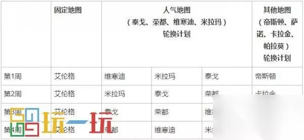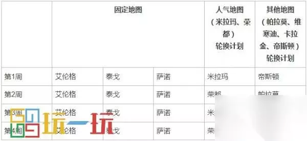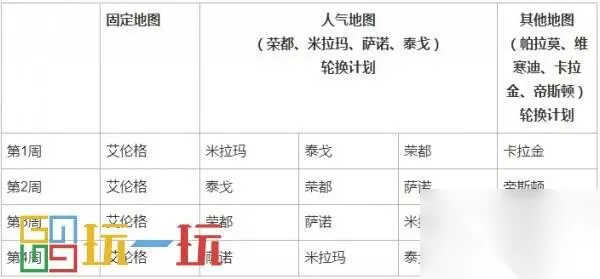 随机选择地图的地区 – 北美、欧洲、俄罗斯、太平洋、南美及主机版本 ※ 当地图阵容中包含帝斯顿时,该周所有地图的匹配概率都为20%。此外的第2、4周的固定地图与人气地图的匹配概率各为22%,其他地图的匹配概率为11%。