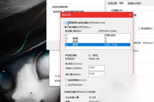 先将自动管理取消掉,在你放爹1的盘那里,比如我的游戏盘,因为默认是2个g的虚拟内存,而我们需要更大,我们用自定义大小来输入你想要的虚拟内存大小,我这里给了5个g