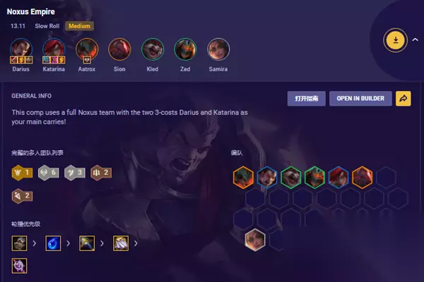 推荐理由:饮血剑可以为诺手提供很好的续航,正义之手可以增加伤害和续航,泰坦则是增加攻速和护甲。 2、阵容推荐 推荐阵容:一暗裔+六诺克+三裁决+二主宰+二潜行。 阵容成员:诺手+卡特+剑魔+塞恩+克烈+劫+沙弥拉。 阵容解析:作为阵容中的双C之一,输出足够且费用低,获得容易,装备好的话前期就可以锁血,阵容成型后加上六诺克的加成,上限很高。