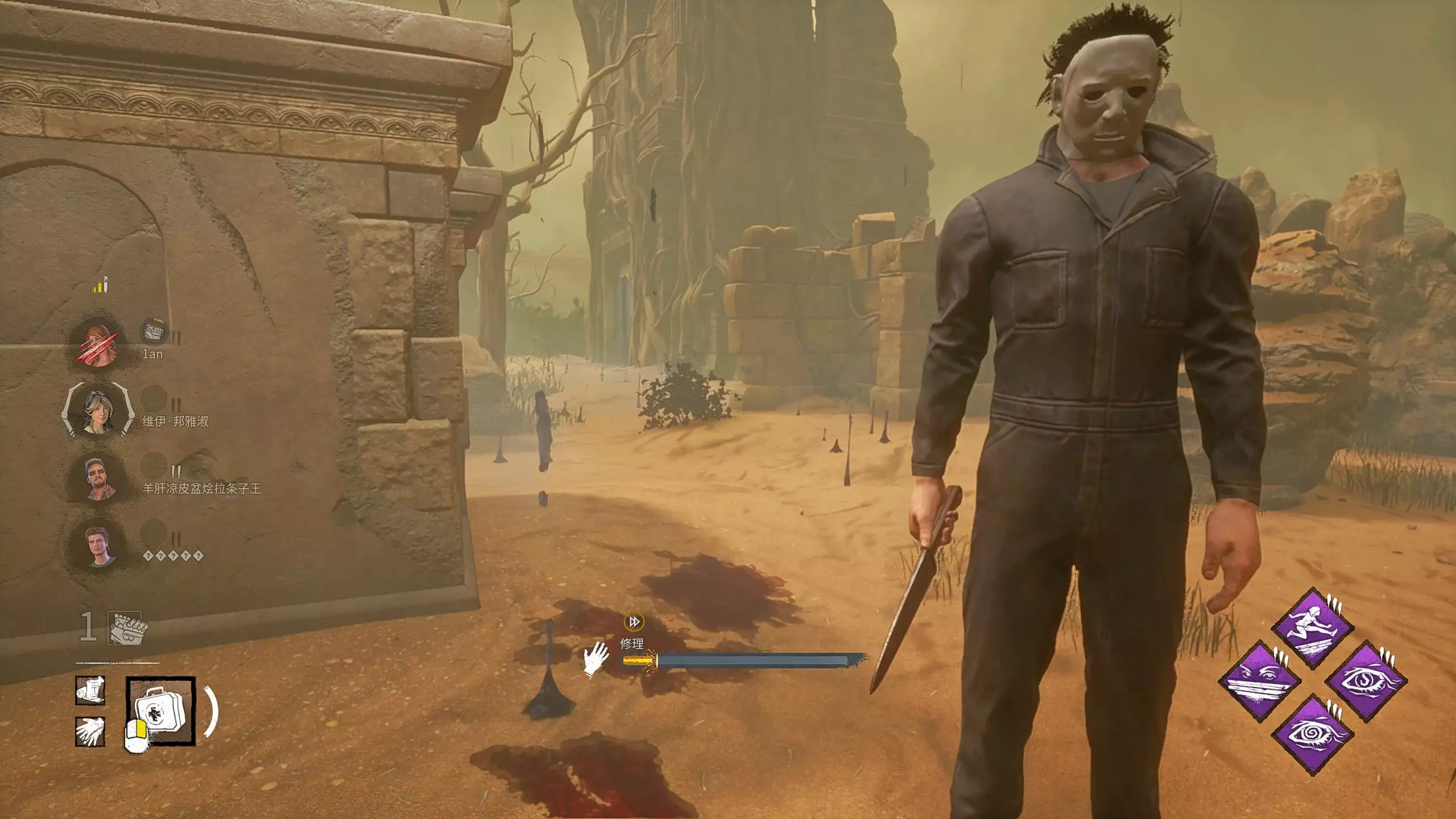 这是恐怖游戏《黎明杀机》的玩法展示,玩家操控屠夫威斯克,凭借其强大的冲撞追击能力,让逃生者难以甩开,还展示了游戏里的技能机制与追击场景。