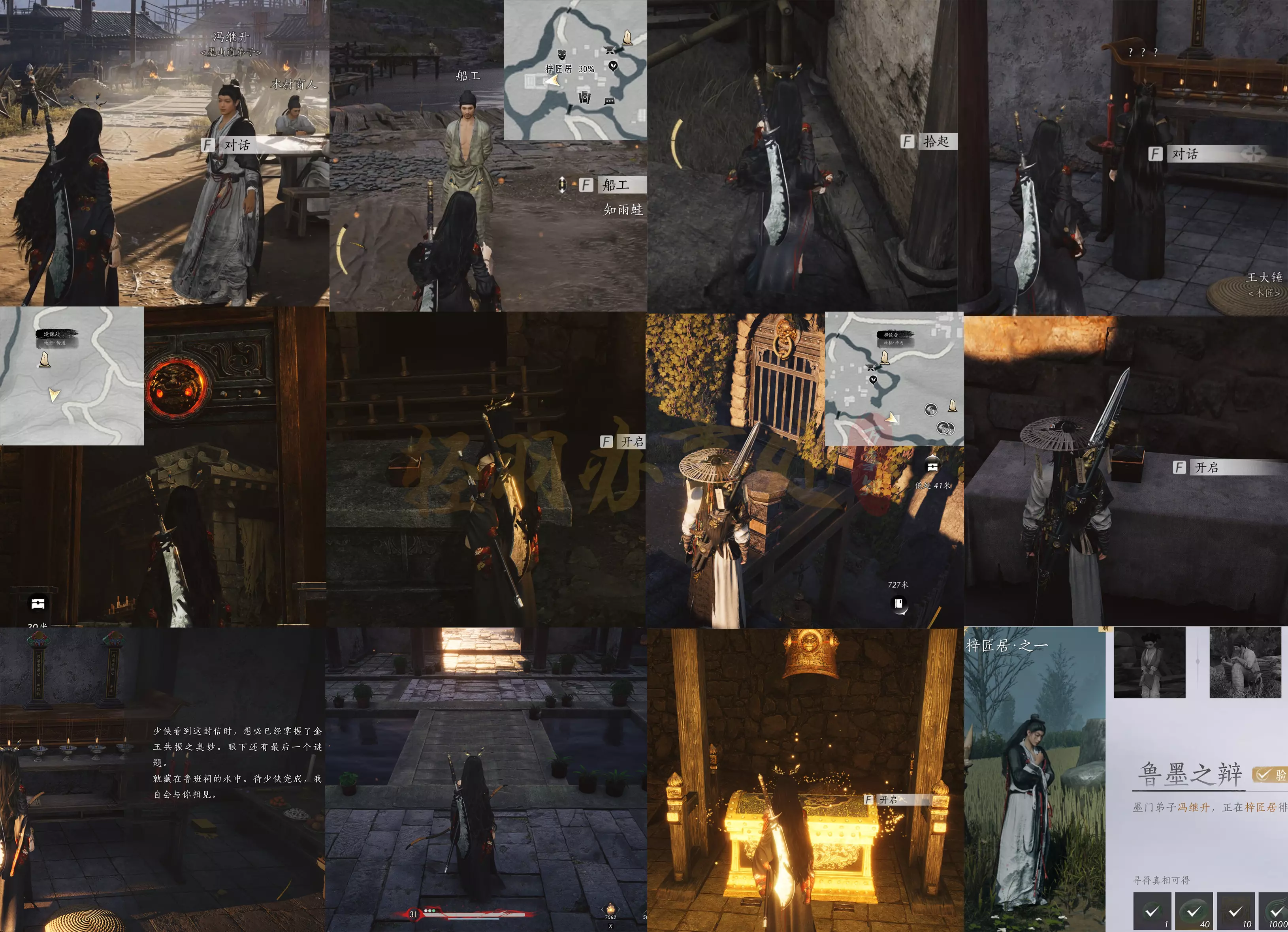 ——鲁墨之辩具体任务流程:1.梓匠居界碑处与冯继升对话2.在梓匠居鲁班祠门口与船工对话并找到他丢失的钱袋交还3.在鲁班祠内与???(容鸢)对话4.前往瓦窑院后完成金击玉碎的解密并开启里面的宝箱5.前往造像处洞窟完成金击玉碎的解密并开启里面的宝箱6.回到鲁班祠查看容鸢留下的信7.从鲁班祠内水池潜水到达实验室完成三处金击玉碎的解密并开启大厅中央的宝箱8.回到梓匠居界碑处与冯继升对话完成任务