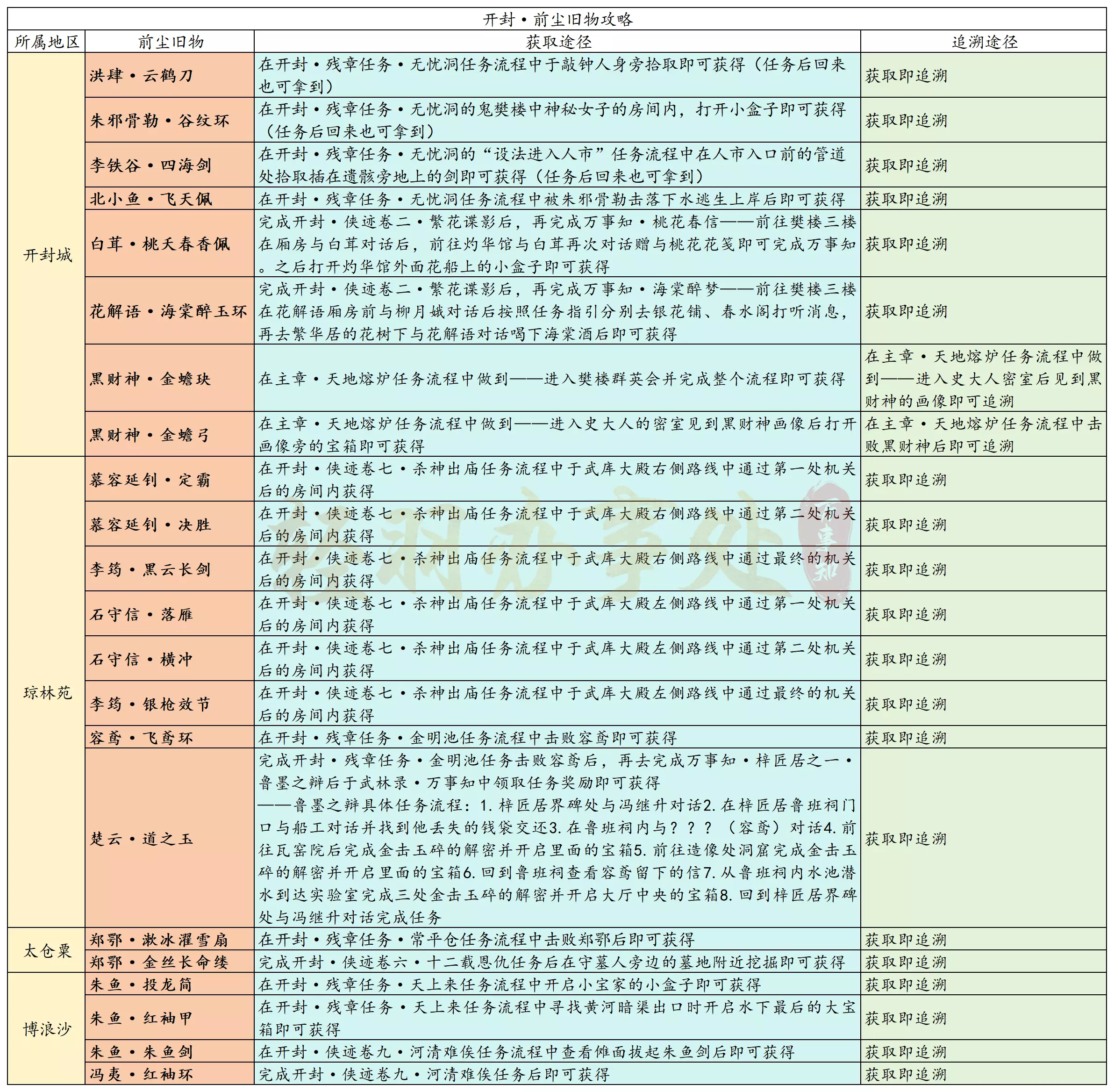 开封旧物一共分为4大区域——开封城、太仓粟、琼林苑、博浪沙,每集齐一个区域的旧物并且全部完成追溯即可去找神秘人对话选“寻物”获得道具“藏锋之意”,开封地区一共可以获得4个“藏锋之意”