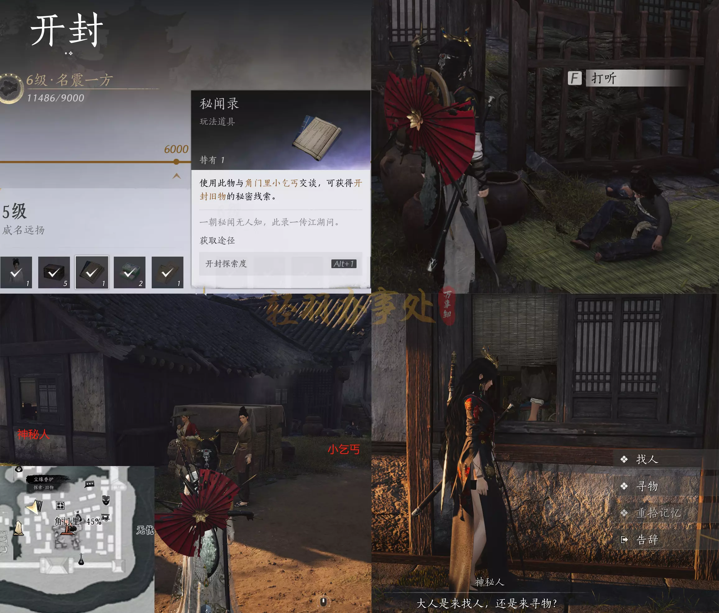 前尘旧物的使用方法:首先是要在开封达到探索度5级获得“秘闻录”后,在角门里界碑附近先找到小乞丐打听,选择“给钱”,再选择“要”,然后再去小乞丐北边一点拐角处在窗口与神秘人对话即开启“前尘旧物”功能,此处有三个对话选项——“找人”:可以获得未获得的旧物线索,根据线索找到旧物即可;“寻物”:集齐每个地区所有的旧物并追溯后可获得“藏锋之意”;“重拾记忆”:可以拿回已经拆解掉的旧物装备,自动扣除500宋元通宝。