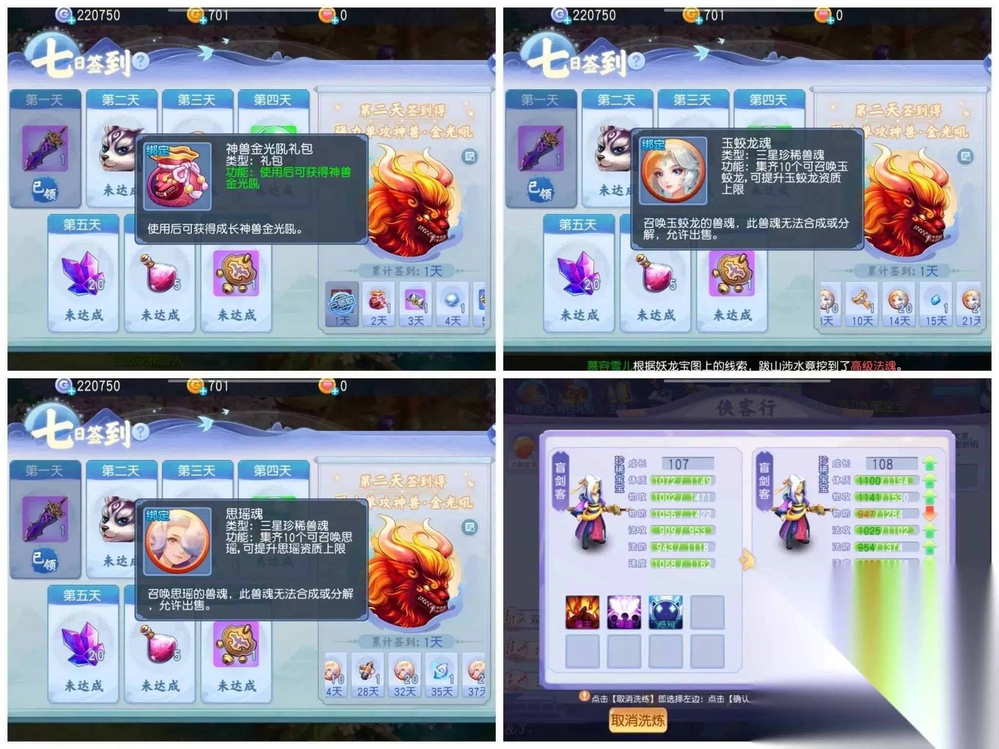 五、灵兽 免费宝宝一览(可用的)①赤焰龙 神兽 首冲6元;②金光吼 神兽 签到第二天;③炸弹猫 二星珍兽 完成炸弹猫任务 有返利(洗炼道具和打书金子全部返还);④玉娇龙 三星珍兽 签到8天初魂 14天半魂 21天全魂;⑤思瑶 三星珍兽 签到24天初魂 32天半魂 38天全魂;⑥盲剑客 二星珍兽 完成侠客行任务;⑦藏宝图有概率挖到各种一星珍兽和二星珍兽影豹;⑧妖龙宝图有概率挖到各种珍兽;⑨妖龙宝箱有概率开到二星珍兽和三星珍兽。