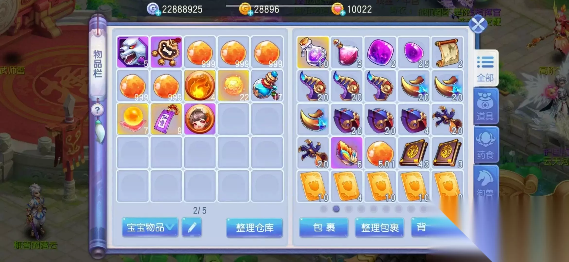三、资源、金子 ①洗髓丹、高级洗髓丹、仙灵符(洗练宝宝和打书);②炼魂石(炼魂);③珍兽魂(召唤珍兽、分解获得通灵碎片升级法阵);④彩凤羽、羽魂石(升级翅膀);⑤御兽铃、御兽精魄(强化坐骑);⑥灵武碎片、灵武神石(升级灵兽灵武);⑦祈星石、幻月石(升级天赋);⑧神赋(强化神赋);⑨精灵之光(召唤精灵并对其升级);⑩金子是最重要的资源,主要来源有日常、藏宝图、妖龙宝图,有能力的小伙伴也可以开妖龙宝箱和抽取各种活动。注意:你不知道用来干什么的道具就先留着。