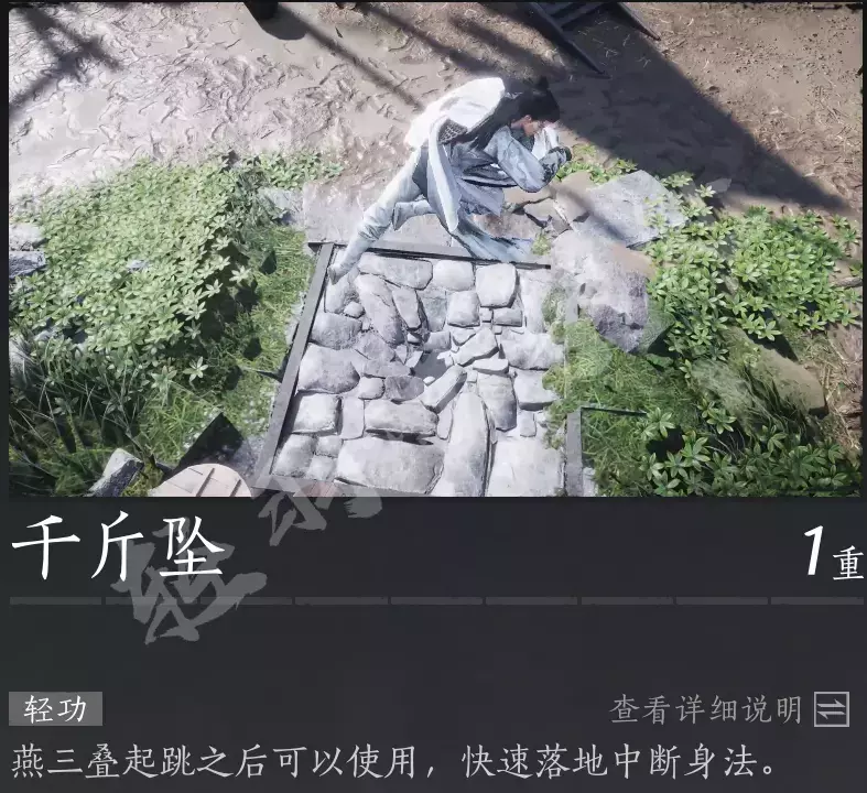 本作中角色可以进行三段跳,空中按冲刺还可以进行位移。这赋予了角色穿越不同地形的强大机动力。在空中按Q使用「千斤坠」可以快速落地,也可以用于打破一些特殊地面,进行解谜。