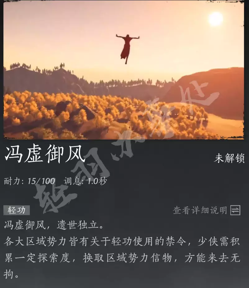 可以跳跃到高空中,进行超长距离快速移动的技能,也是跑图神技,一共有4种特效,使用条件同样是探索度到达4000领取奖励:暮云佩。不会消耗耐力值,但下落过程中记得使用【万钧坠】着地,不然人物有几率获得不健康的状态
