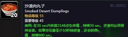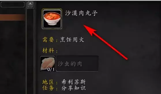 如何获得魔兽世界中的沙漠肉丸子配方呢?沙漠肉丸子是魔兽世界的一种特色菜肴,其主要材料是沙虫的肉。然而,要想烹饪出这道美味,你必须先掌握沙漠肉丸子的配方。接下来,我将为你提供一份魔兽世界怀旧服沙漠肉丸子配方的获取指南,指导你如何通过完成特定任务轻松获得这个配方。 魔兽世界怀旧服沙漠肉丸子配方学习攻略 沙漠肉丸子 学习方法: 需要烹饪等级290级,在希利苏斯处完成任务。 具体学习方法: 1.首先,你需要在希利苏斯的坐标(51.9,39.2)找到NPC卡兰德拉斯,他会给你一个任务,任务的目标是寻找食谱。 2.接着,你需要前往希利苏斯的另一个坐标(37.9,45.3),在那里你会找到一个盖满沙子的烹饪书,这本书中就有你需要的破碎的食谱,拿到它就可以完成任务。 3.任务完成后,返回到卡兰德拉斯那里,他会教你如何制作沙漠肉丸子。 4.最后,你可以制作10个沙漠肉丸子,通过完成余下的任务,你将获得一些金币作为奖励。 二,魔兽世界沙漠肉丸子材料获取一览 1、首先玩家来到希利苏斯找到塞纳里奥要塞的卡兰德拉斯接任务,就会获得沙漠肉丸子的食谱。