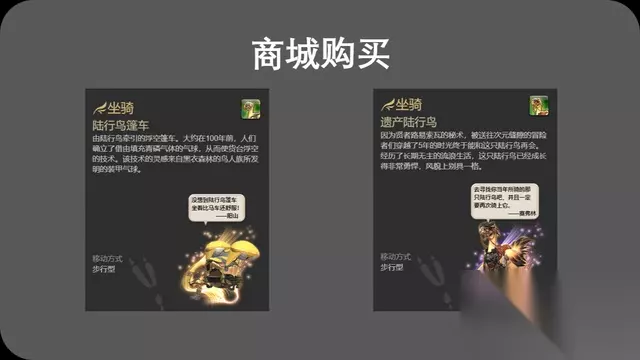 寻宝鉴定 商城购买 这是最直接也是最简单的获得坐骑的方式,玩家可以在商城花费点券或者积分购买到坐骑。比如花费22800点券可以购买得到陆行鸟篷车,花费98万商城积分可以购买得到遗产陆行鸟。