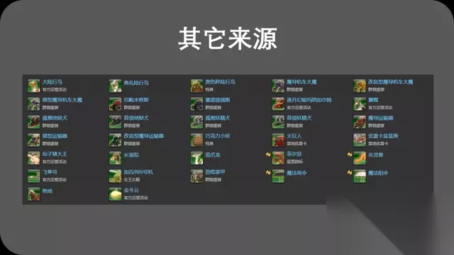 其它来源 值得一提的是,《最终幻想14》里的部分坐骑并非只是单一的获得方式,有些坐骑甚至可能有两种或者多种的获得方式哦。