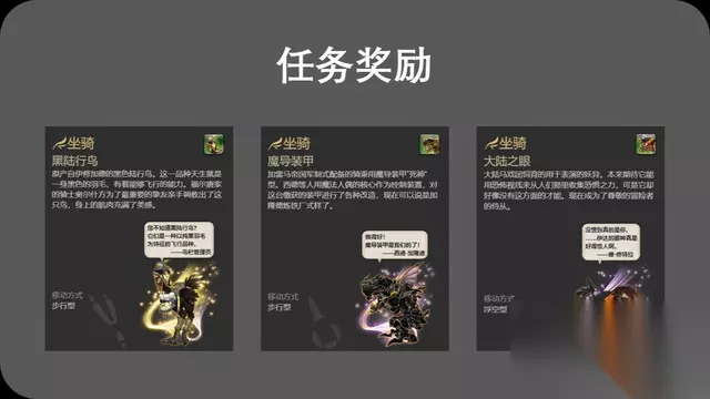 采集制作 任务奖励 玩家完成某些任务之后,也可以获得坐骑的奖励。比如黑陆行鸟在完成任务“苍穹骑士”后即可获得;魔导装甲在完成任务“超越幻想,究极神兵”时也能得到;大陆之眼则需要玩成“守护天节与恐怖视线”才可以获得。