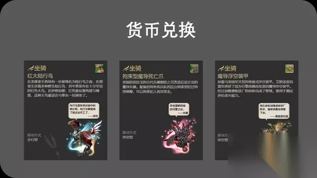 《最终幻想14》 货币兑换 在《最终幻想14》中,所谓的“货币兑换”实际上是指游戏中的多种可以用来兑换坐骑的货币和道具,比如金币、成就币、魔金锡币等等。 例如,红大陆行鸟这个坐骑,就可以通过使用8份黄金陆行鸟的羽毛来兑换红大陆行鸟笛,从而获得红大陆行鸟坐骑。拘束型魔导死亡爪这个坐骑则需要6个成就币来兑换。魔导浮空装甲则需要20000个狼印战机来兑换。 所以,虽然用于兑换的货币或道具类型各不相同,但是他们的本质都是通过货币兑换的方式来获取坐骑。除了上述的几种坐骑外,还有许多其他的坐骑也可以通过这种方式来获取。