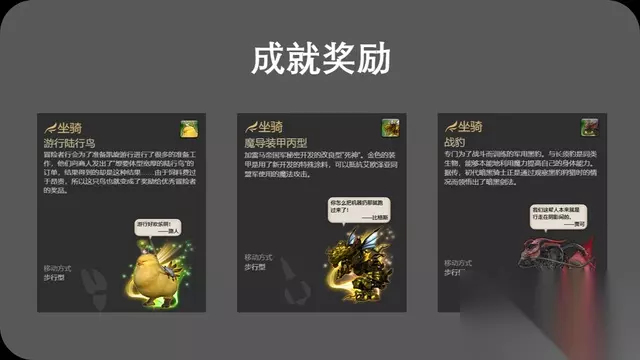 任务奖励 成就奖励 玩家达成游戏成就,也能获得坐骑。玩家达成成就“令人难忘2”可以获得坐骑游行陆行鸟;达成成就“铭记不忘的队友”可以获得坐骑魔导装甲丙型;达成成就“毅然暗黑骑士”则可以获得坐骑战豹。除此之外,像斗豹、斗狮、战狮、斗熊等坐骑都是通过成就奖励获得的。