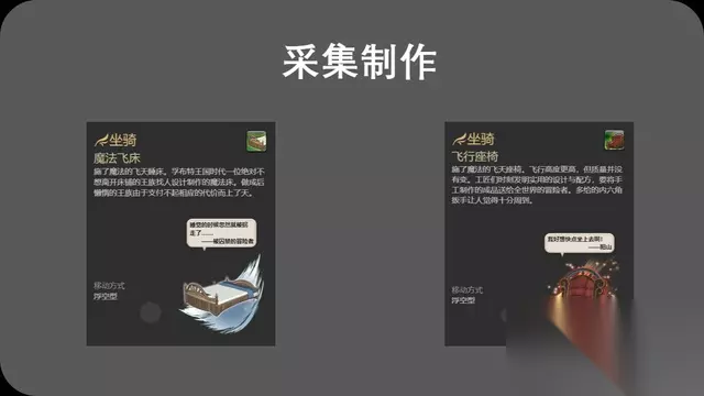 副本掉落 采集制作 采集制作是指玩家通过收集一定的材料,然后按照配方制作出坐骑。比如魔法飞床和飞行坐椅就是通过这种方式制作而来的。魔法飞床的制作配方是30个风之晶簇、30个冰之晶簇、3个附魔榆木木材、4个棉绒和4个白云花。飞行座椅的制作配方是30个水之晶簇、30个雷之晶簇、8个白云花和1个海滨沙发。