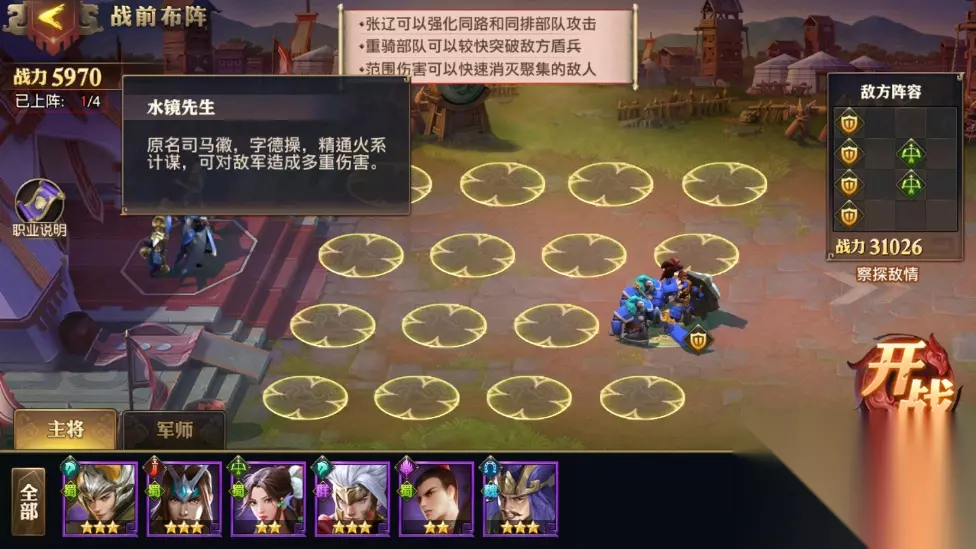 2军师: 1、原名司马徽,字德操,精通火系计谋,可对敌军造成多重伤害。 2、要利用好军师的技能释放,不然想要靠挂机直接过关肯定是不可能的,多试几次即可。