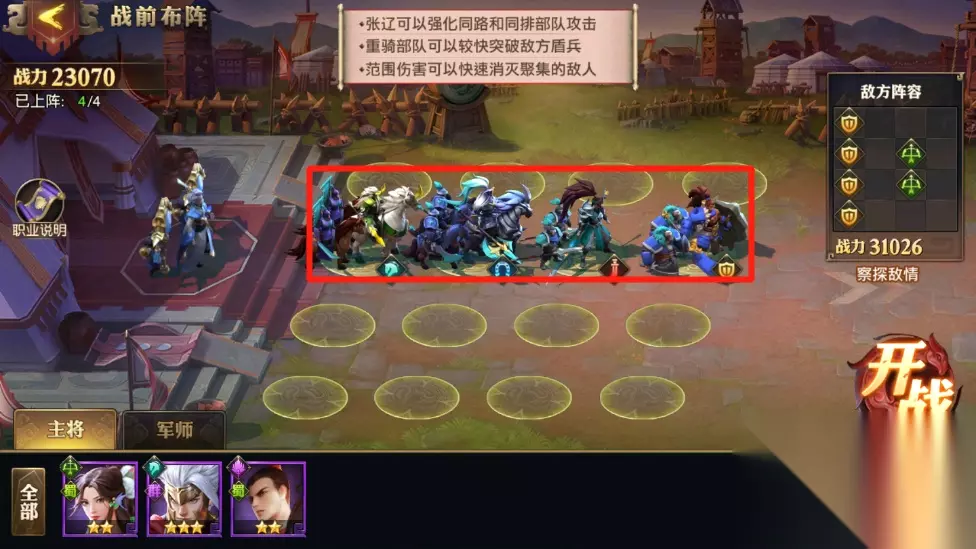 一、战前布阵 1训练要点:利用布阵位置及兵种的目标选择规则,快速消灭敌方后排与前排部队。 2过关思路:敌人的队伍配置是横向一排摆放,玩家的战斗力不高,因此需要集中火力一个点来找到突破口。