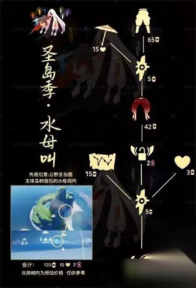 先祖兑换图 1、工装裤:兑换需要65根白蜡烛 2、水母头:兑换需要42根白蜡烛 3、一张乐谱:兑换需要15根白蜡烛 4、随机魔法:兑换需要10根白黄蜡烛 5、光翼节点:解锁需要2根升华蜡烛 6、水母叫:接到先祖后免费获得