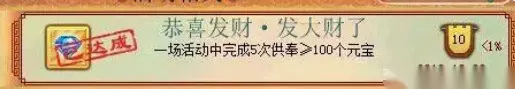 隐藏成就完成方法: 盆满钵满:恭喜发财活动中单次供奉120个元宝后捕捉成功恭喜发财·聚宝盆:在活动中供奉≥100元宝并捕捉成功达到50次恭喜发财·发大财了:一场活动中完成5次供奉≥100个元宝恭喜发财·暴发户:一场活动中完成5次供奉120个元宝