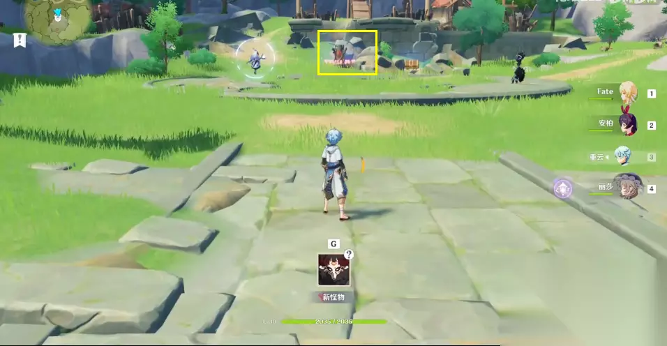 2、东方黑日族:火柱子 黄框内就是柱子了,把旁边的两个boss杀掉,柱子旁边的光圈消除,即可用火属性人物安柏,激活这个火柱子。 击杀技巧:怪物外面有一层保护盾,建议大家用诺艾尔砍它,把外边的那层保护罩破除,就很好打了。