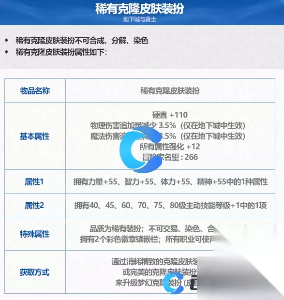 《DNF》地下城与勇士稀有克隆皮肤装扮获得方法介绍 地下城与勇士稀有克隆皮肤装扮获得方法介绍 一、物品名称 稀有克隆皮肤装扮 二、基本属性 1、硬直+110 2、冒险家名望266 3、所有属性强化+12 4、物理伤害追加量减少3.5%(仅在地下城中生效) 5、魔法伤害追加量减少3.5%(仅在地下城中生效) 三、属性1 拥有力量+55、智力+55、体力+55、精神+55中的1种属性 四、属性2 拥有40、45、60、70、75、80级主动技能等级+1中的1项 五、获得方法 通过消耗毛精致的克隆皮肤装扮变换器,或完美的克隆皮肤装扮变换器来升级梦幻克隆装扮(皮肤)后获得。