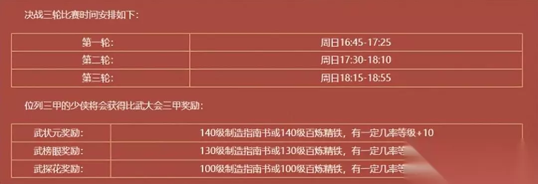 决战阶段开启时间为周日16:45-19:00。这个阶段中会选取在追逐战中获胜的两个阵营,由各阵营中演武等级最高的队伍进行对决。对决赛制为三轮单循环赛,也就是说共有9场对战,总胜场数高的一方将成为本届天下英雄比武大会的最终胜者! 而获胜阵营的三甲战队成员会根据队伍排名,分别获得武状元、武榜眼、武探花称谓。