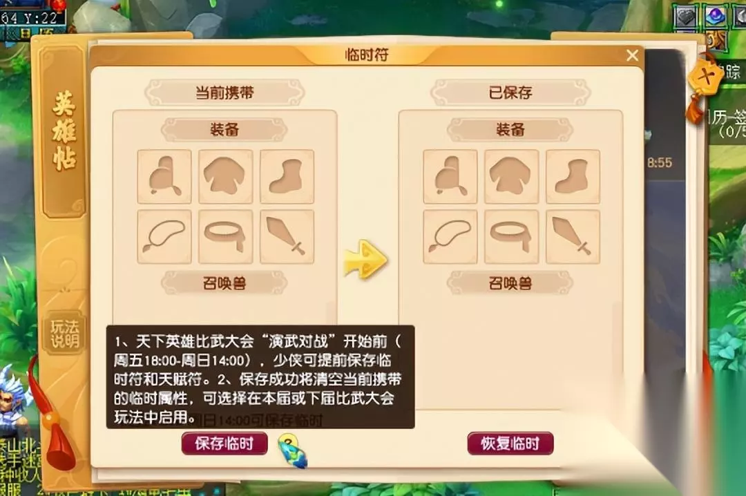 需要注意的是,比武报名开始后,大家可以选择点击“英雄帖”进入临时符保存界面,这里可以保存装备临时符和召唤兽天赋符,保存之后会清空身上的临时符、天赋符属性。除此之外,临时符可以选择在本届比武或者下届比武中选用。 二、新比武由追逐战开始,失败三次会离场