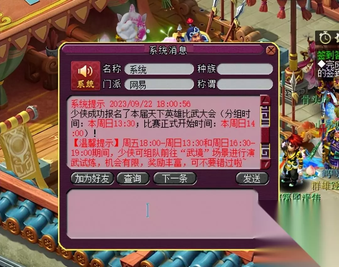 首先,修改后的比武大会依然需要报名参加,但找NPC报名后不再需要缴纳梦幻币,而是会收到一封系统邮件,告知报名是否成功、分组时间、正式开始时间。与此同时,自周五18:00-周日13:30,大家都可以组队前往“武境”演武。
