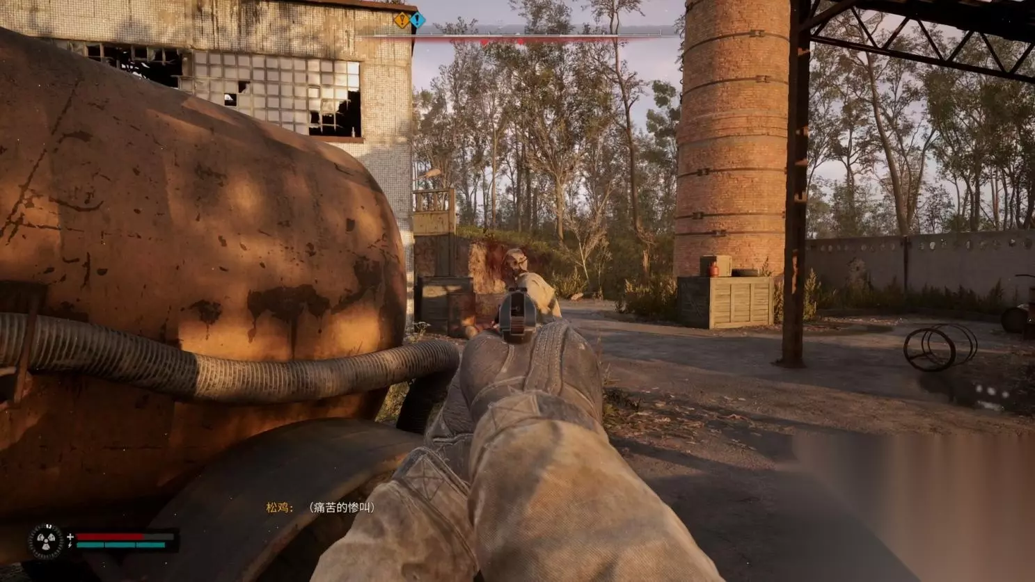 从扫描仪后方的缺口走出,右边会有敌人在烤火,我们的子弹和血量并不是很多,要小心,可以引过来撤到缺口后进行攻击,在【潜行者】难度下,如果敌人没有头盔,大部分人形怪物爆头还是一下致命的。