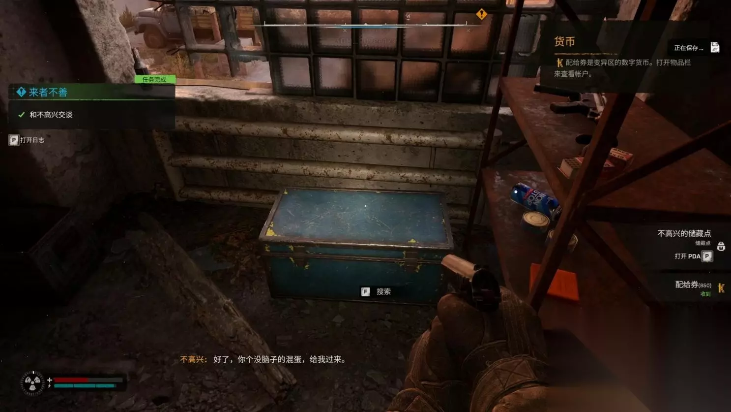 击败全部敌人后,可以在二楼找到不高兴,不过他确实很不高兴为什么自己被抛弃了,在对话中得知,他的补给被这伙强盗放在了锅炉房的山洞中,可以去里面拿,同时他的身后也有很多补给。