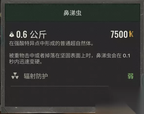 这个【鼻涕虫】就是我们获得的第一个超自然体,可以提供少量的辐射防护,超自然体可以装备在护甲上,不同的护甲的槽位也不同,提供的属性也不一样。