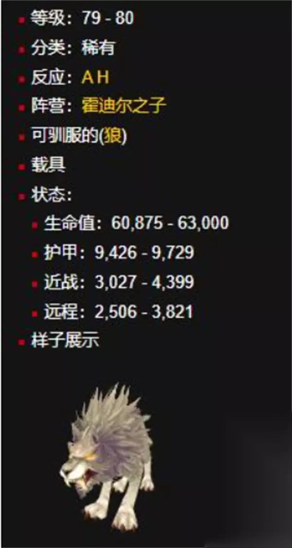 三、基础属性 等级区间:79 - 80 生命值:约 60,875 ~ 63,000 护甲值:约 9,400+ 攻击力: 近战:3,000 ~ 4,400 远程:2,500 ~ 3,800 阵营归属:霍迪尔之子 反应:敌对(对联盟与部落均为红名) 特殊说明:不可作为载具,但可驯服为猎人宠物