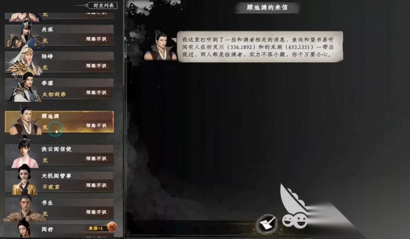 第二个坐标点位于钓龙湖畔,此处同样存在漏洞,完成该点的所有流程后,你将获得两封书信和两块令牌作为任务物品。打开任务线索界面,此时会出现新的渊者组织选项。你需要将两封信放入对应槽位并选择第一项,令牌则选择第三项进行验证。若验证失败可以重复尝试选择,此应为系统漏洞,多次操作即可解决。