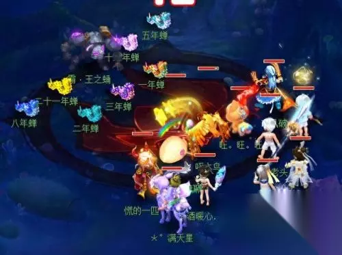 战斗胜利后,就可以与知了王阵影开启小副本的决战。知了王之王为花果山,倾世蝗妃为盘丝洞,巨角天牛为大唐官府,铁甲蜈王为天机城,右边的知了仔为方寸山,左边的知了仔为魔王寨。建议:封印知了王之王,击杀巨角天牛。毕竟是BOSS战,所以一定要注意点杀。