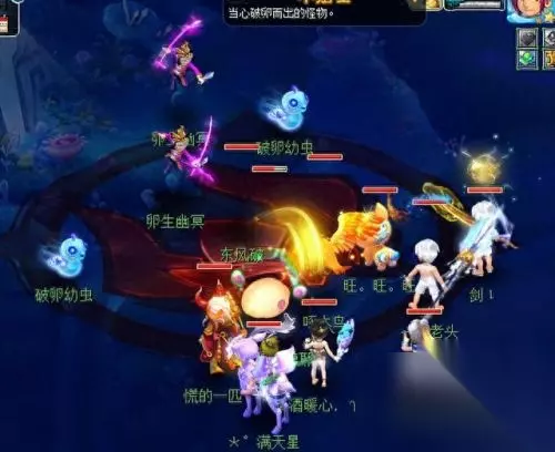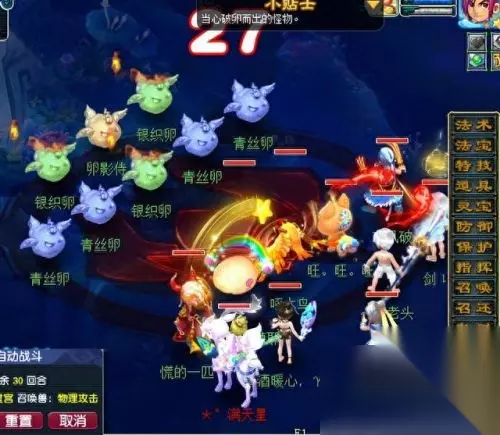 然后与卵影侍对话,开启小副本的第1场战斗。卵影侍为普陀山,青丝卵为天机城,银织卵为凌波城。建议:封印银织卵,优先击杀未被封印的银织卵。