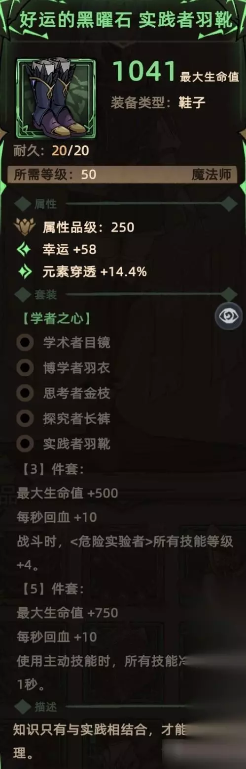 1. 实践者羽靴 掉落地点:全局掉落; 关键词:随机词条、生命(套装效果)、生命恢复(套装效果)、危险实验者技能等级(套装效果)、技能冷却(套装效果)。