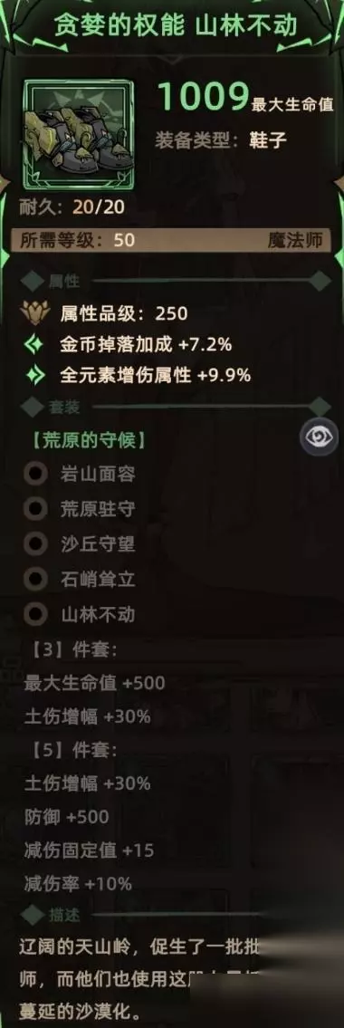5. 山林不动 掉落地点:全局掉落; 关键词:随机词条、生命(套装效果)、土伤增幅(主动触发、套装效果)、防御(套装效果)、减伤(套装效果)。