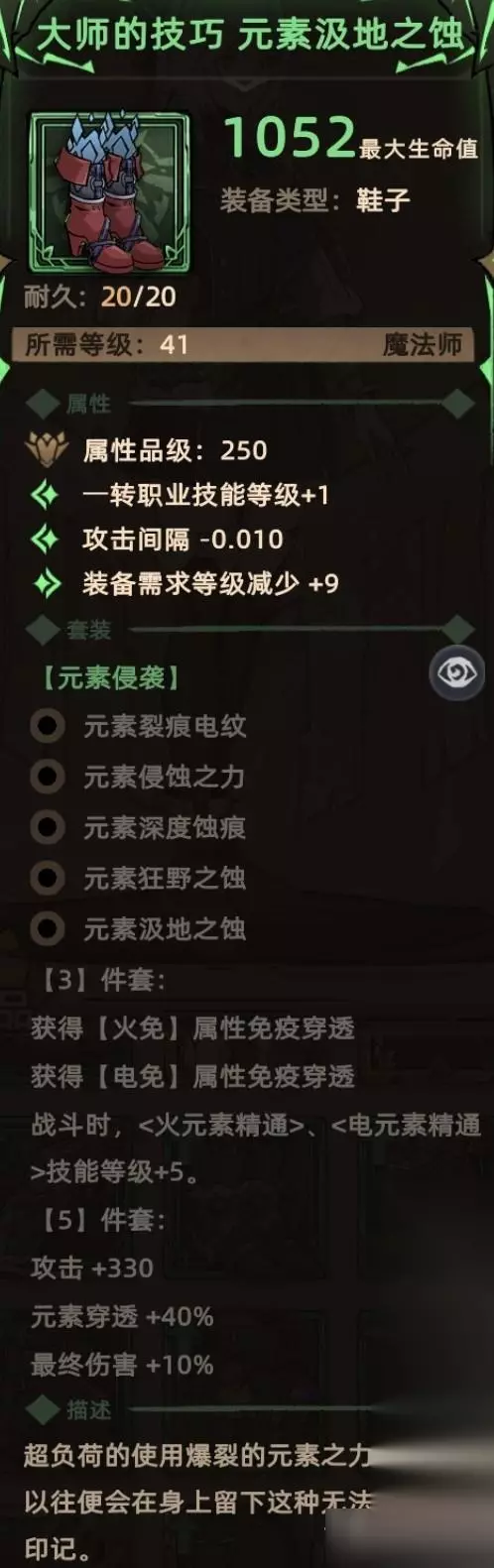3. 元素汲地之蚀 掉落地点:全局掉落; 关键词:随机词条、火免贯通(套装效果)、电免贯通(套装效果)、火元素精通技能等级(套装效果)、电元素精通技能等级(套装效果)、攻击(套装效果)、元素穿透(套装效果)、最终伤害(套装效果)。