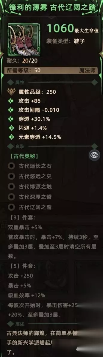 2. 古代辽阔之踏 掉落地点:全局掉落; 关键词:随机词条、双重暴击(套装效果)、暴击(套装效果)、buff移除(套装效果)、攻击(套装效果)、吸血(套装效果)、爆伤(套装效果)。