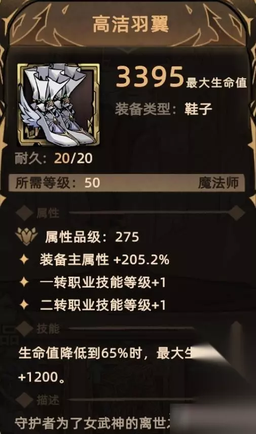 5. 高洁羽翼 掉落地点:全局掉落; 关键词:装备主属性、一转技能等级、二转技能等级、根性(生命)。 Tips:根性,以生命值为条件触发的技能(保命技能居多)。一般而言技能效果强大但触发条件苛刻或副作用大,常见如“在1秒内受到超过最大生命值100%的伤害时,生命值降为1,冷却时间30秒”,“受到超过最大生命值30%的伤害时,将该伤害降低为最大生命值的30%,对超过最大生命值100%的致死伤害无效”等,少见如“生命值低于10%时,造成的所有伤害翻倍,持续15秒,结束后生命值归零”等。